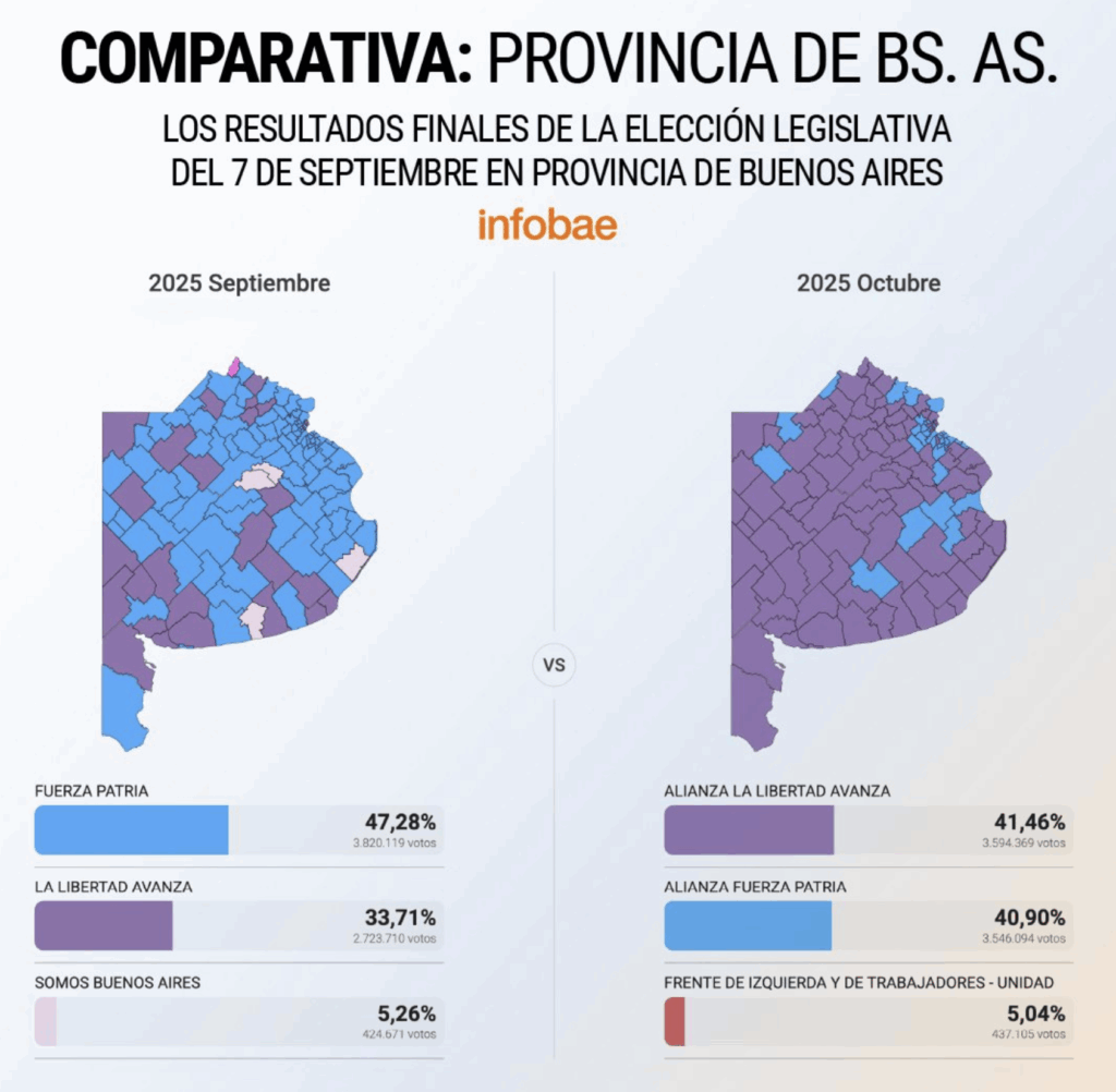 El resultado de las elecciones legislativas del 26 de octubre de 2025 en Argentina desató una intensa polémica. Tras una derrota en las Primarias Abiertas, Simultáneas y Obligatorias (PASO) de septiembre, La Libertad Avanza (LLA) de Javier Milei logró un vuelco histórico en la Provincia de Buenos Aires.